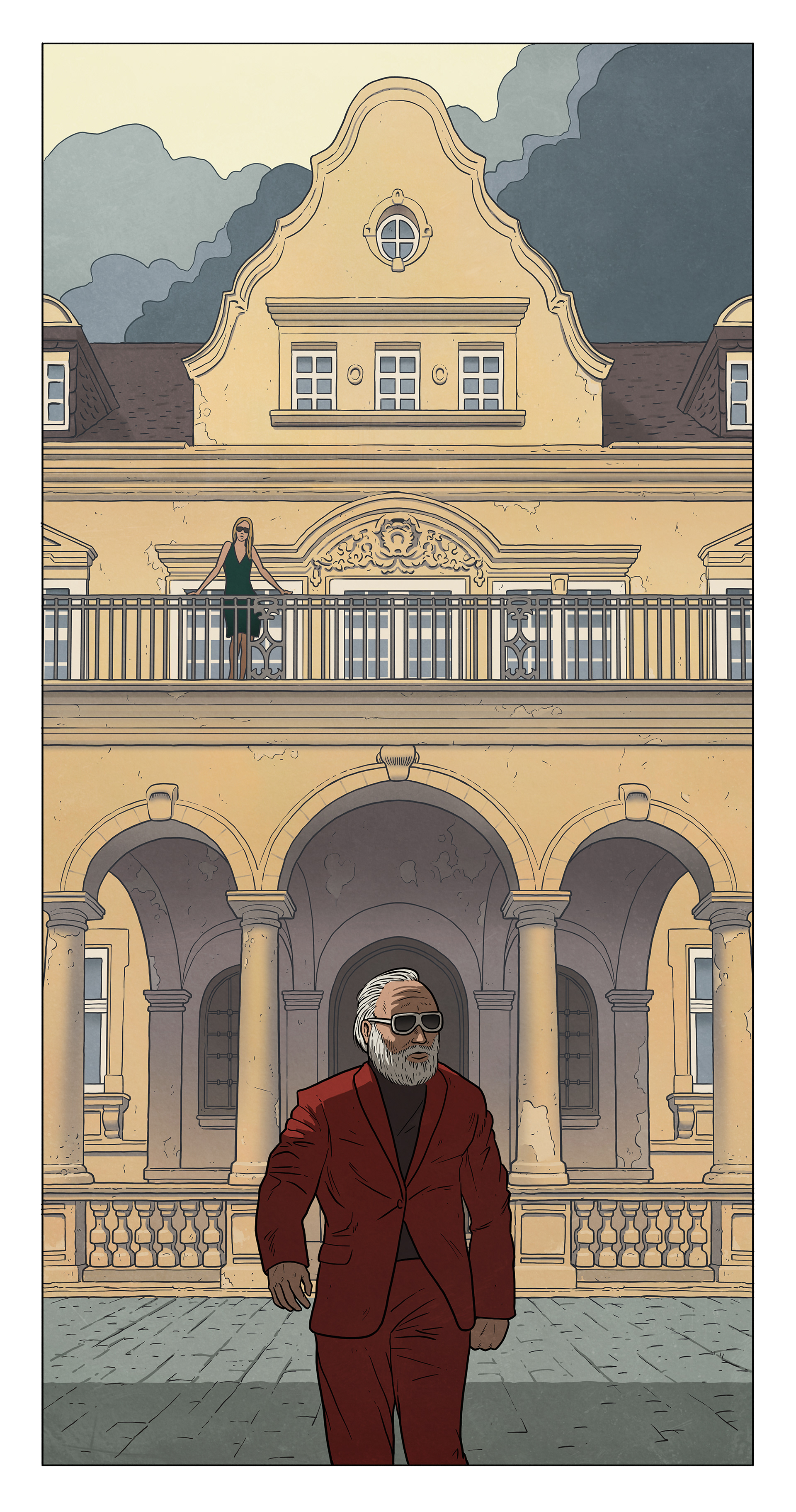 Pitch Deck für einen angedachten Reklame-Comic in dem der lustige Supergeil-Mann aus der Edeka-Werbung von vor ein paar Jahren mit dem Zauberfahrstuhl eines globalen Aufzug-Konzerns unterwegs sein sollte.